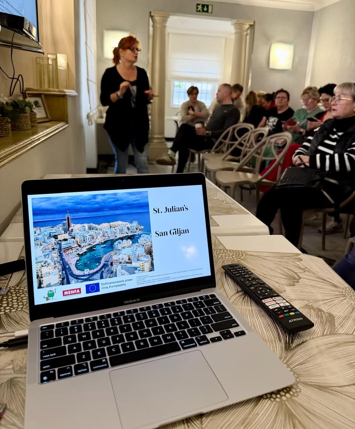 Dzień rozpoczęliśmy od rozgrzewki kulturowo-językowej w formie gry miejskiej po St. Julian’s. To było coś więcej niż spacer – miasto stało się narzędziem edukacyjnym. Uczestniczki poruszały się w małych grupach, realizując zadania językowe i kulturowe, ćwicząc komunikację w codziennych sytuacjach: pytanie o drogę, orientację w przestrzeni, reagowanie na nieoczekiwane sytuacje. Ruch, słońce, rozmowy i współpraca sprawiły, że nauka odbywała się naturalnie, bez presji i stresu. Dla wielu kobiet był to moment przełamywania lęku przed mówieniem, przed byciem „nieidealną”, przed popełnianiem błędów. Bardzo wyraźnie było widać, jak z każdą kolejną minutą rośnie swoboda i pewność siebie.